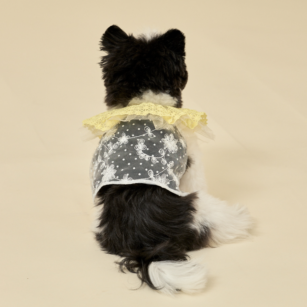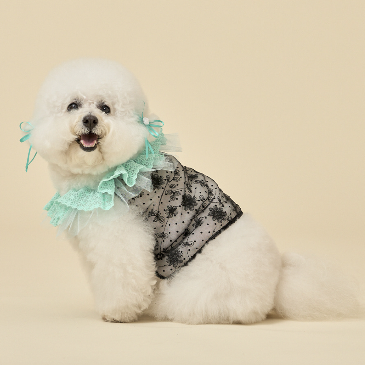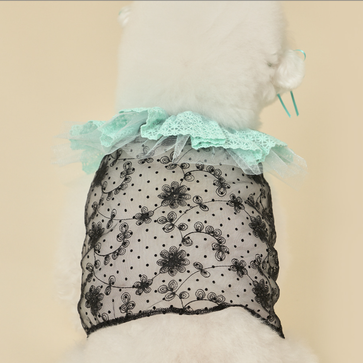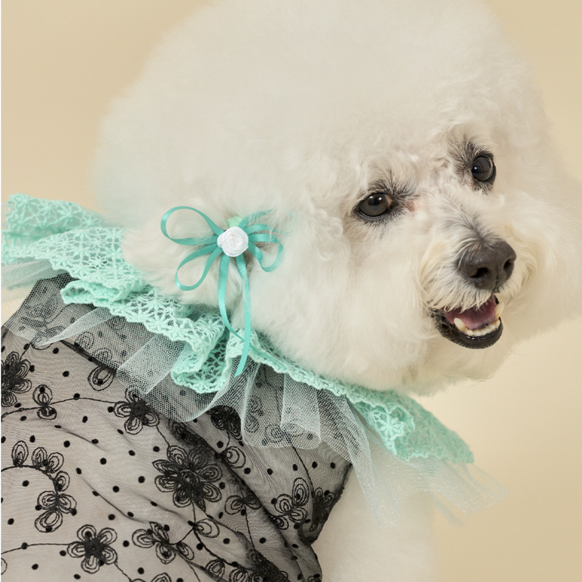 鮮豔的蕾絲衣領,搭配透膚花朵上衣,呈現出清新亮麗的樣子。
