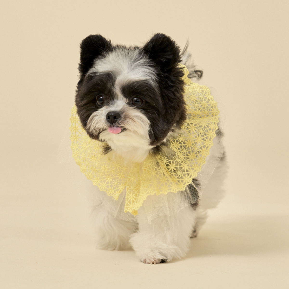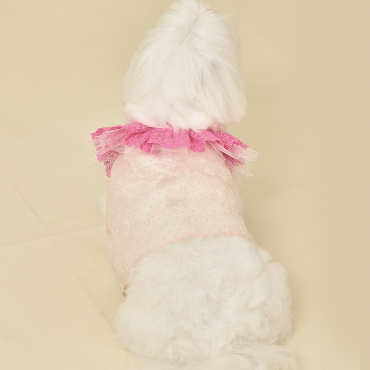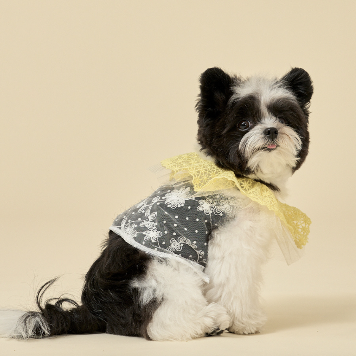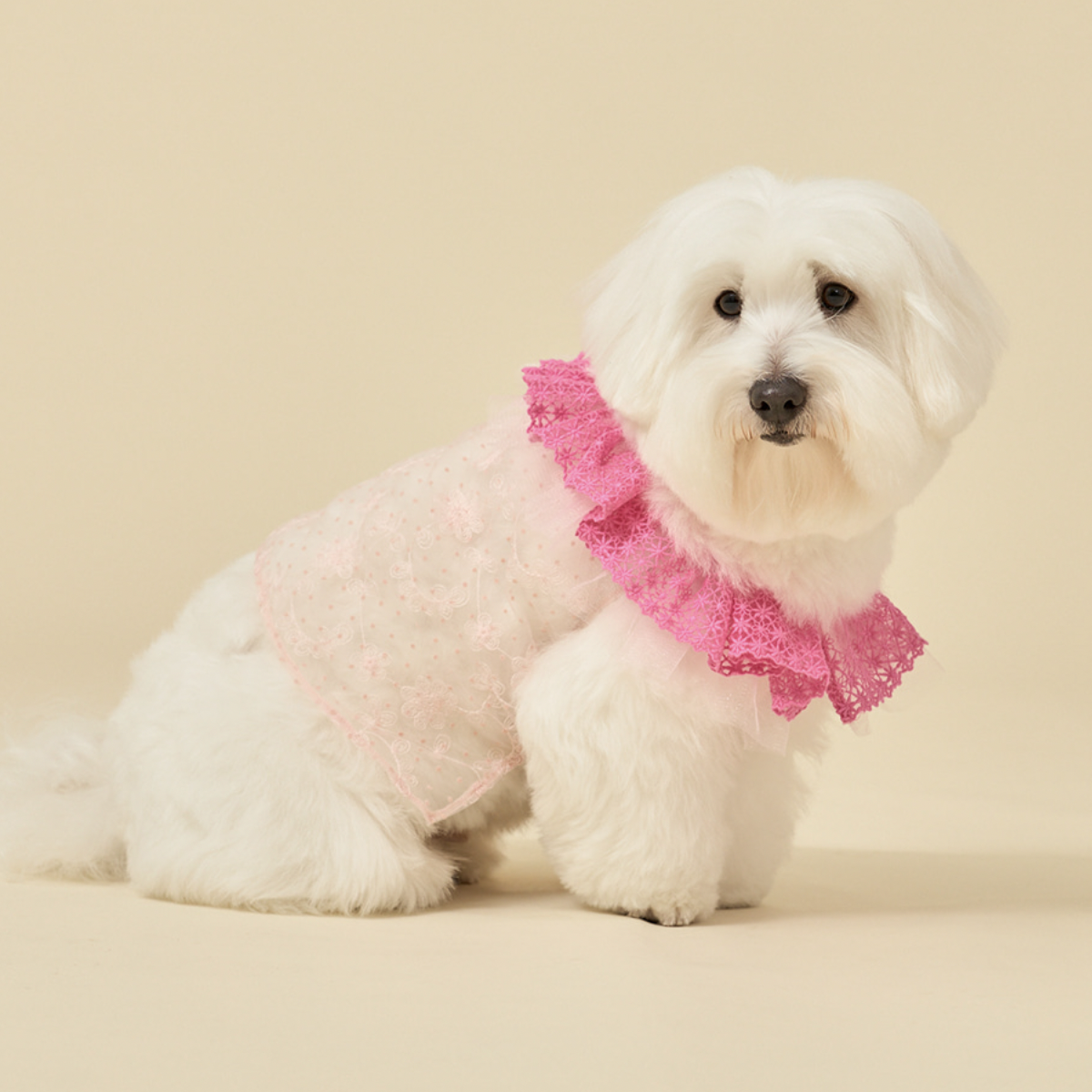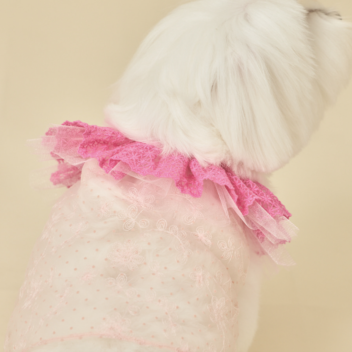 鮮豔的蕾絲衣領,搭配透膚花朵上衣,呈現出清新亮麗的樣子。