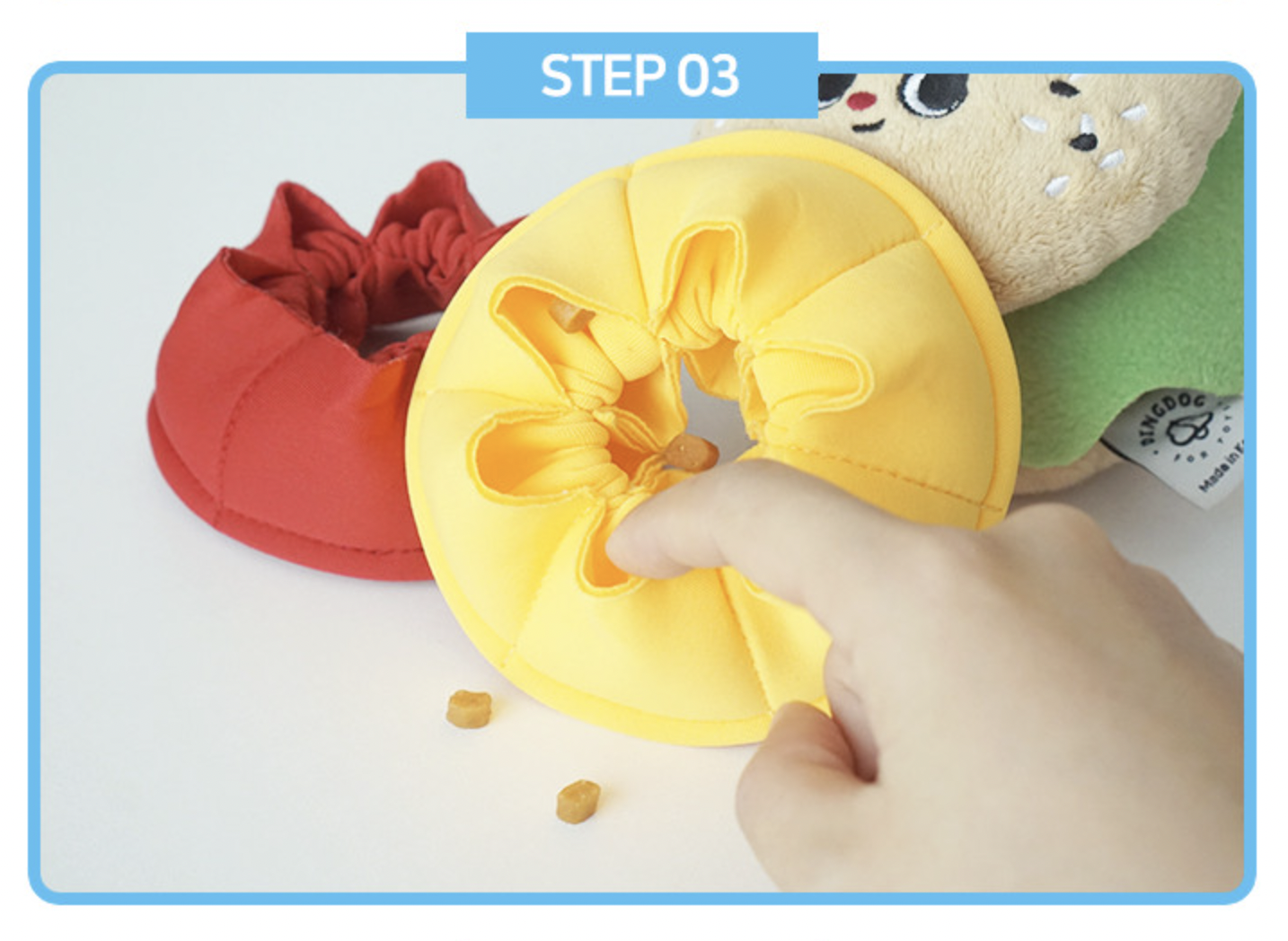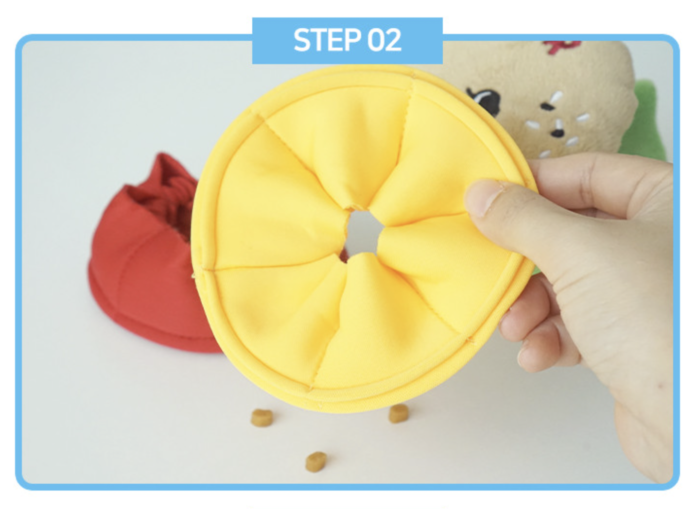 毛孩運用滾動、啃咬、踩踏、拉動漢堡的方式找到藏在其中的零食,就算不放藏食玩起來也是樂趣無窮!