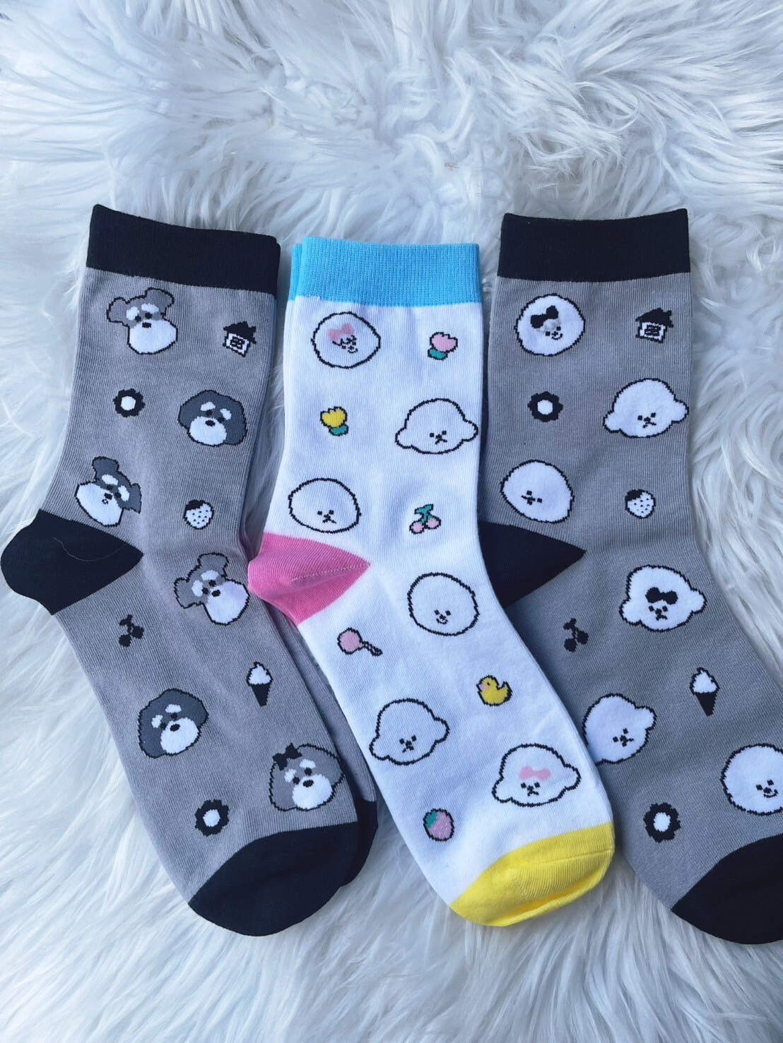 比熊襪子有可愛的白色和耐髒的灰色;雪納瑞款襪子則是灰色。